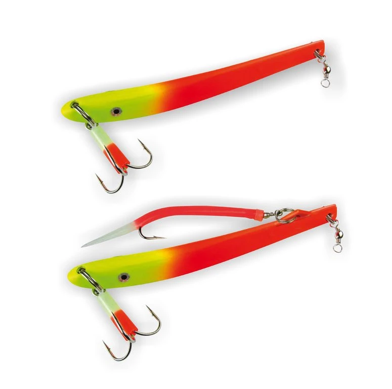 Diese sehr fängige Taumel-Pilker ist mit seiner Bananenform ein sehr beliebtes Modell. Sehr häufig kommt der Biss schon in der Absinkphase. Dieses Modell hat eine gelbe Spitze und einen roten Schaft. Sie können wählen zwischen sechs verschiedenen Gewichten von 100g bis 600g. Es gibt diese Pilker wahlweise mit Makk am Kopf, um auch die Kopfbeisser zur haken, oder ohne Makk. Die Variante mit Makk gibt es 600g, während das klassische Model ohne Makk bis 500g verfügbar ist.