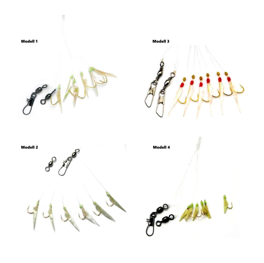 Diese Makrelen- und Heringsysteme besitzen sechs Haken, die mit echter Fischhaut und selbstleuchtende Perlen verziert sind. Gebunden sind sie an Fluoro-Carbon-Schnur. Diese Hochleistunsschnur ist Made in USA. Die Haken haben eine Größe von 4 bzw. 6. Das Modell 2 besitzt Circle Hooks.