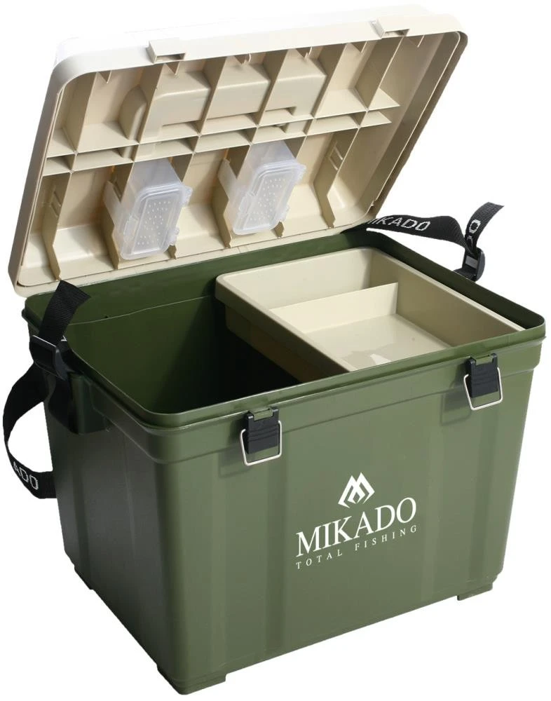 Diese spezielle Box dient für die Aufbewahrung von Angelzubehör, die auch als Sitzgelegenheit dient, Die Größe beträgt 44cm x 32cm x 36cm (LxBxH).