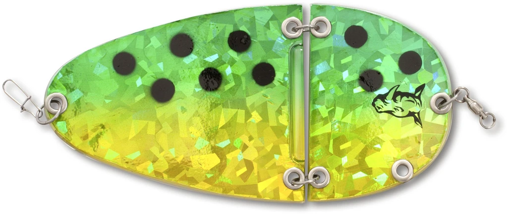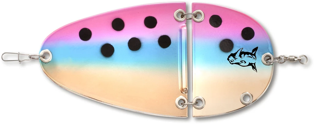 Der K2 Flasher ist der erste zweiteilige Flasher aus dem Hause Rhino. Sein verlockender Lauf wird Blinker- und Naturköderangler gleichermaßen begeistern. Durch seine seitlichen Ausbrüche, gepaart mit unregelmäßigen Drehungen, hat dieser Flasher schon in der Probephase gezeigt, dass er Lachse, Meerforellen und Dorsche zu betören weis. Durch seine einzigartige Bauform macht dieser Flasher im Drill so wenig Druck, dass man das Gefühl hat, man drillt die Fische an der freien Schnur. Ein wahres Drillvergnügen ist sicher. Dieser Flasher ist in sechs verschiedenen Farben verfügbar, wobei die Rückseite abhänig von der Farbe gefärbt ist. Der Flasher ist in einer Länge von 12,5cm oder 18cm verfügbar. Dabei hat er ein Gewicht von 21g bzw. 53g.