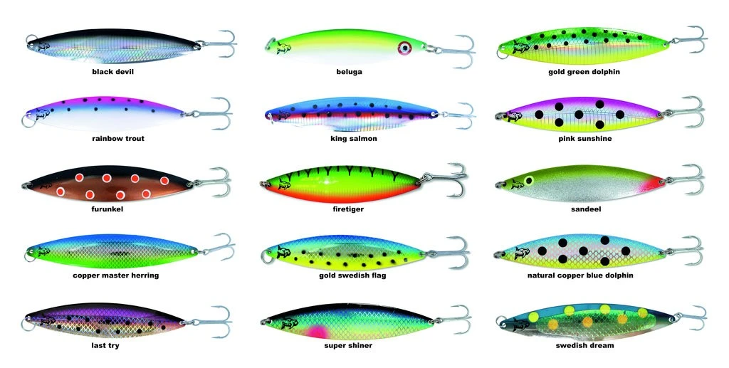 | 10 | King Salmon | Blau-Silber mit Magentastreifen – ein echter Sonnenschein. Mit Kupferinnenseite der Geheimtipp vieler Trolling Guides in den letzten Jahren. Fängt topp bis 15 Meter. |