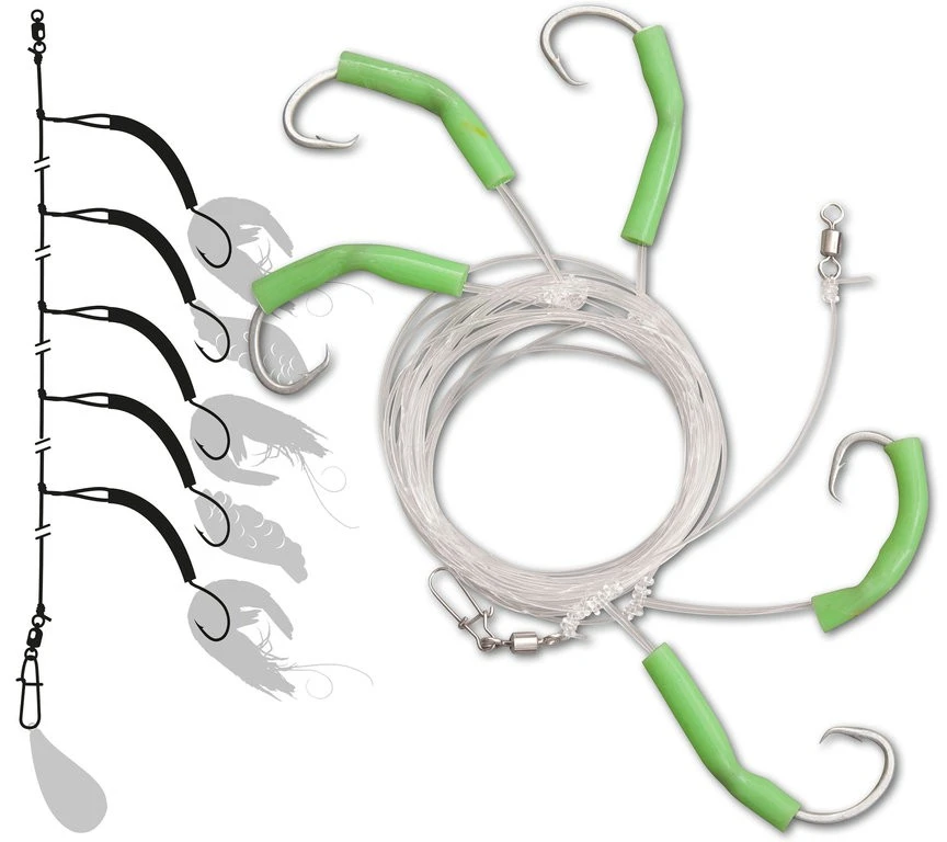 Dieses Rotbarsch-Vorfach besteht aus 5 Einzelhaken Systemen mit je einem Einzelhaken der Größe 7/0 für eine Garnele oder Fischfetzen, sowie einem Leuchtschlauch an jedem Haken. Die Hauptschnur hat ein Stärke von 1,00mm mit einer Tragkraft von 50Kg. Die Gesamtlänge beträgt 500cm. Das Vorfach ist ideal für das Bootsangeln auf Rotbarsch. Die Lieferung erfolgt auf einem runden Aufwickler.