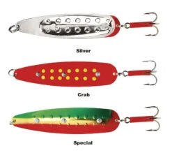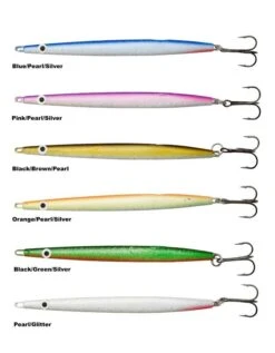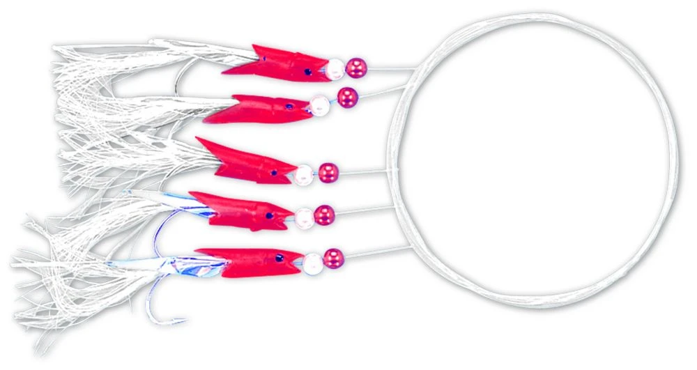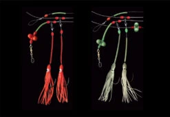 Dieses Vorfach besitzt 5 rote oder 5 phosphoreszierenden Fischchen und farbigen Perlen. Gebunden sind die an Haken der Größe 2/0 an einer Schnur m,it einem Durchmesser von 0,50mm. Verfügbar ist das Vorfach in zwei verschiedenen Farben.